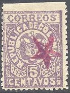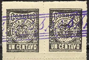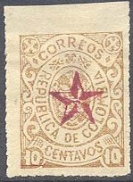 The plates of the 5 c red on yellow was used to create the 1 c and 2 c stamps. Parts of the '5' can still be seen in these stamps. These stamps are imperforate or rouletted. The control-overprint consists of wavy lines, a star or lilly.